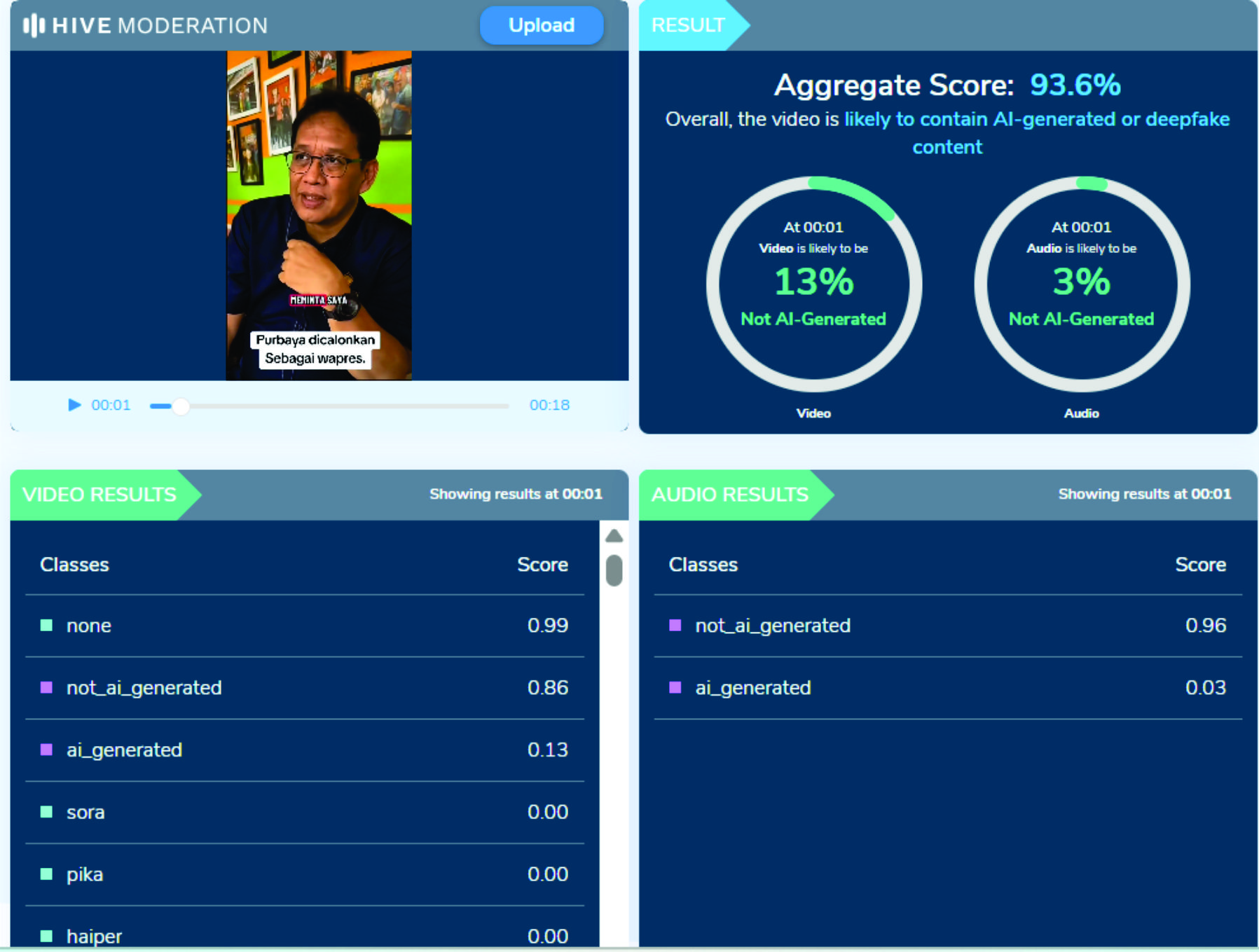 Tim Pemeriksa Fakta Mafindo (TurnBackHoax) menganalisis konten menggunakan alat pendeteksi AI, Hive Moderation. Diketahui, video merupakan hasil rekayasa kecerdasan buatan (artificial intelligence/AI), probabilitas atau kemungkinannya mencapai 93,6 persen.